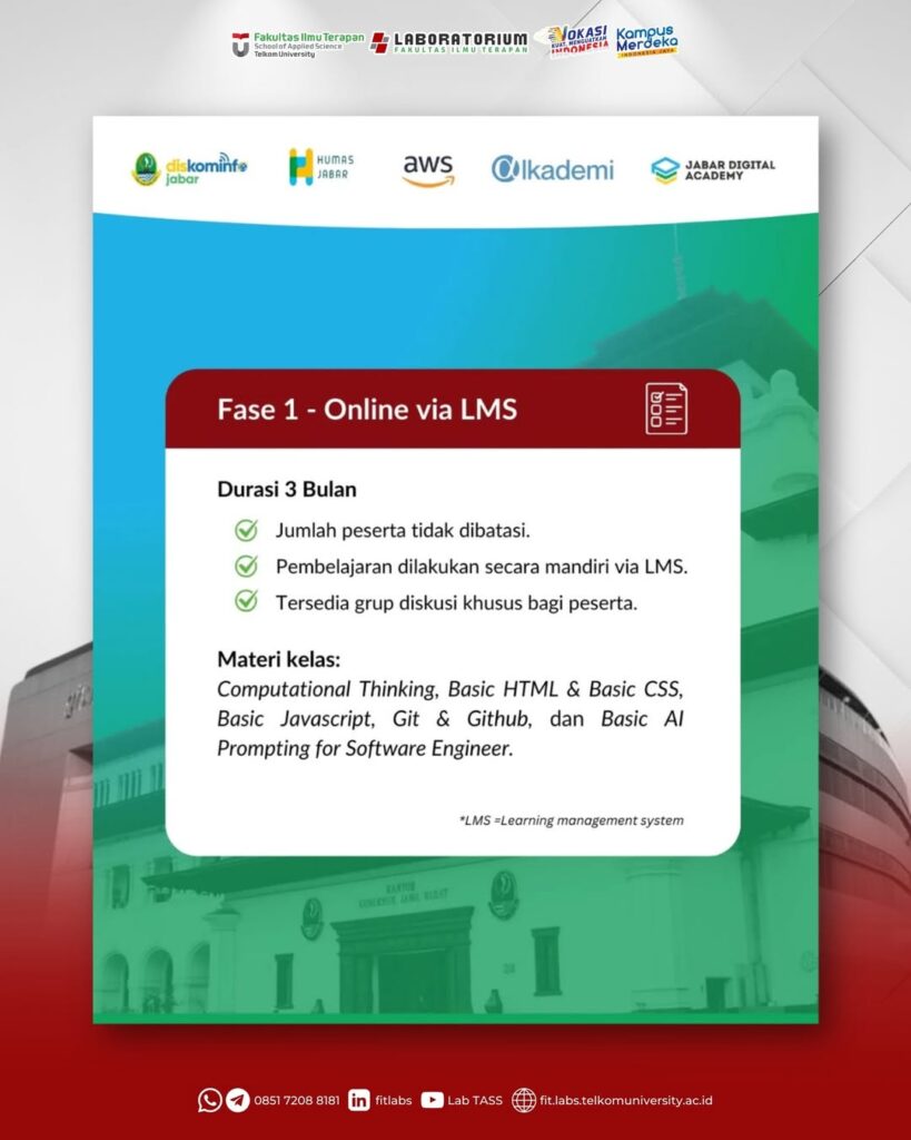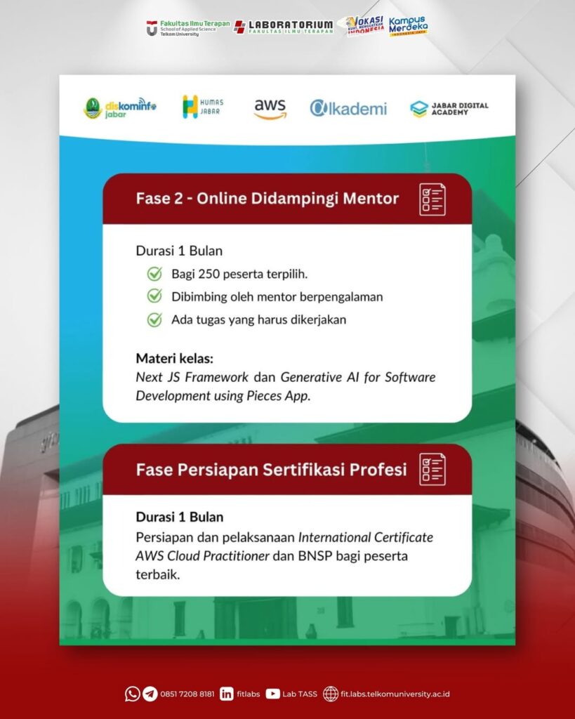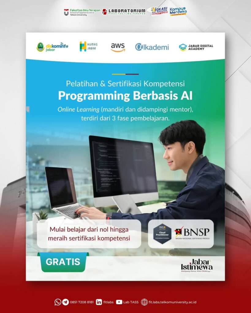 Di Jabar Digital Academy, Wargi bisa belajar Programming Berbasis AI dari nol hingga meraih sertifikasi kompetensi AWS Cloud Practitioner dan BNSP!