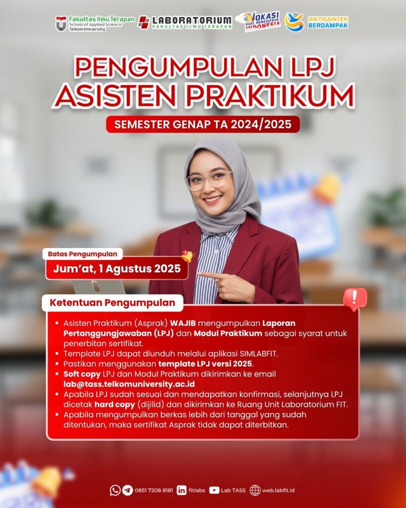 Diberitahukan kepada seluruh Asisten Praktikum (Asprak) Semester Genap Tahun Akademik 2024/2025, bahwa pengumpulan Laporan Pertanggungjawaban (LPJ) akan dilaksanakan dengan ketentuan sebagai berikut.