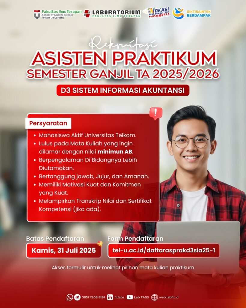 Unit Laboratorium Fakultas Ilmu Terapan dan Program Studi D3 Sistem Informasi Akuntansi Fakultas Ilmu Terapan membuka kesempatan kepada mahasiswa aktif Telkom University untuk mengikuti seleksi sebagai Asisten Praktikum Semester Ganjil Tahun Akademik 2025/2026.