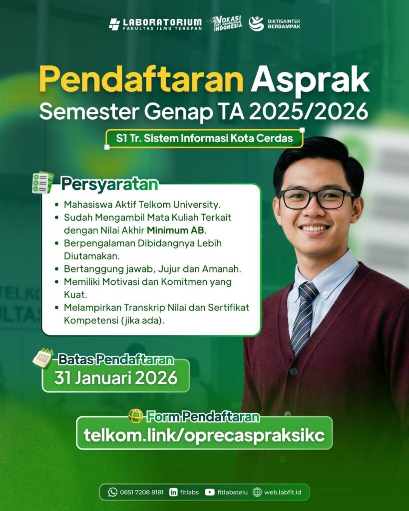 Unit Laboratorium Fakultas Ilmu Terapan dan Program Studi S1 Tr. Sistem Informasi Kota Cerdas Fakultas Ilmu Terapan membuka kesempatan kepada mahasiswa aktif Telkom University untuk mengikuti seleksi sebagai Asisten Praktikum Semester Genap Tahun Akademik 2025/2026.